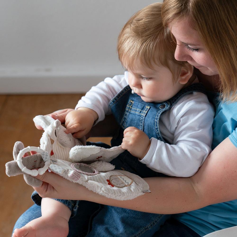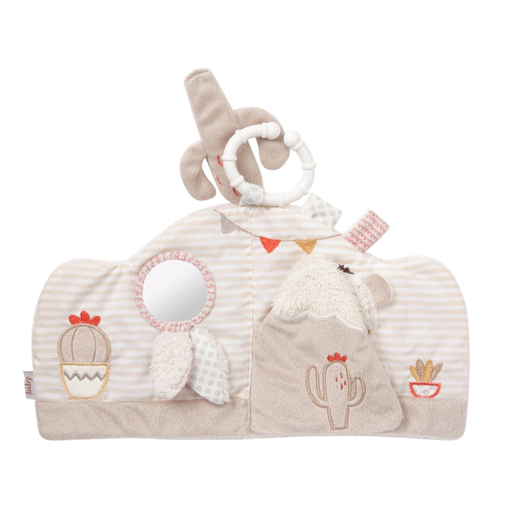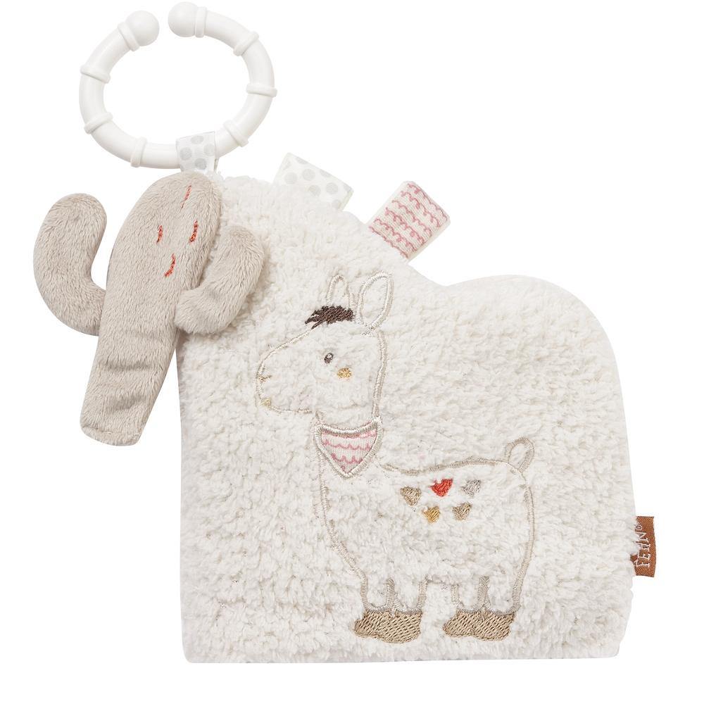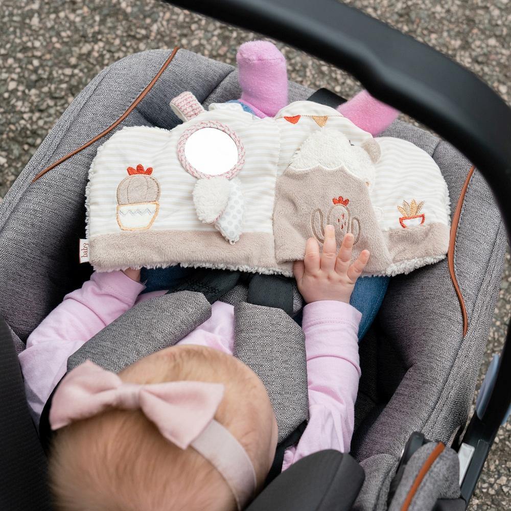 6 páginas con colores y funciones emocionantes para sentir, captar y sorprenderse, la llama una compañera perfecta para bebés y niños a partir de 0 meses. Gracias al anillo de sujeción, el libro se puede acoplar fácilmente al cochecito o la cuna.