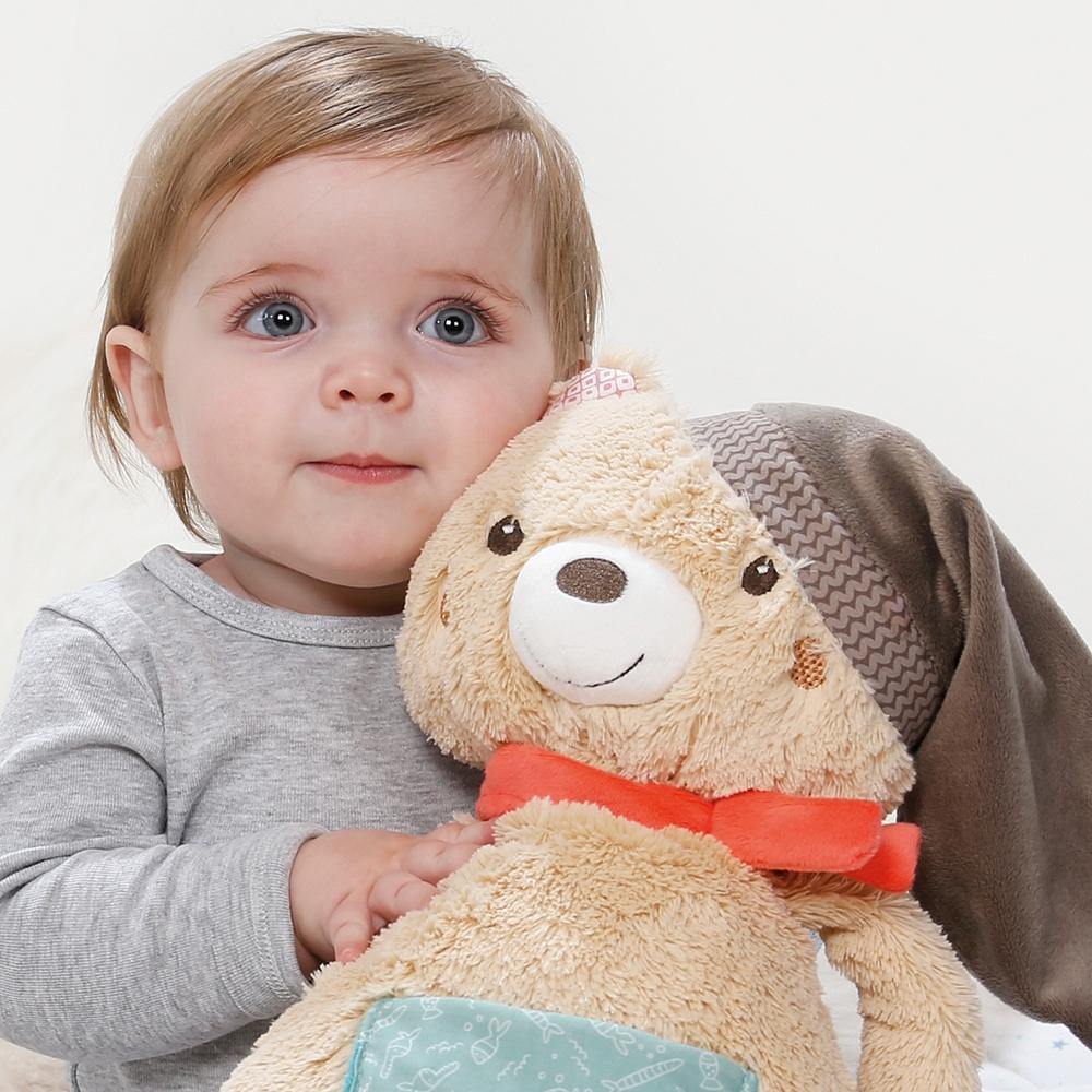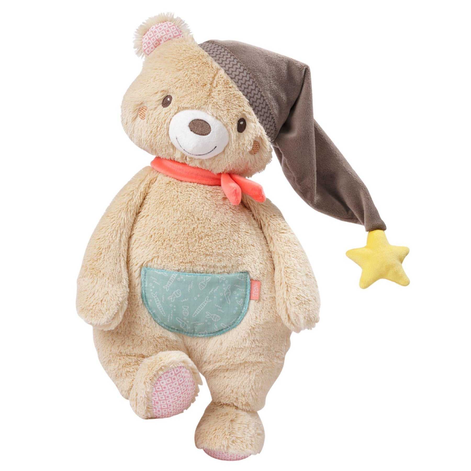 Con brillantes ojos marrones y un abrigo súper esponjoso, el oso de peluche Bruno conquista el corazón del bebé, el primer amigo perfecto para abrazar y acurrucarse. El gorro de dormir invita a sentir y agarrar, la práctica bolsa de vientre es perfecta para guardar chupetes. Tamaño: 42 cm