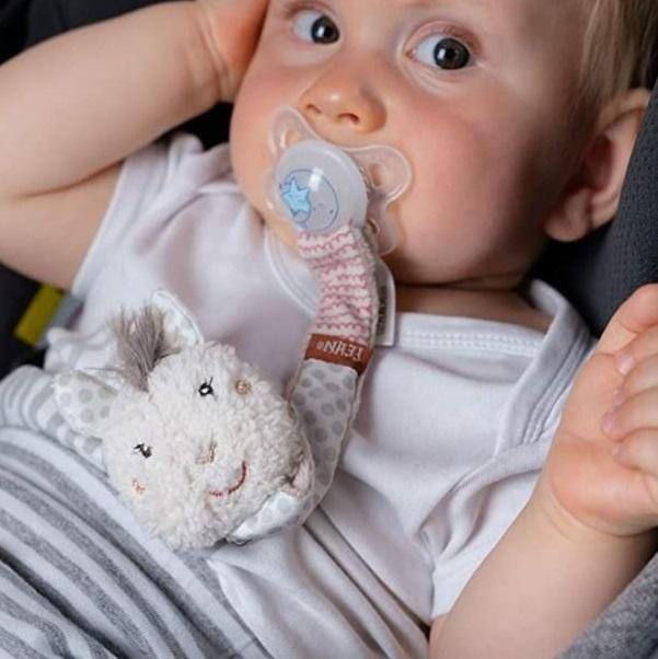 Lleva a la llama siempre contigo con la cadena para chupete con sonajero, apto para todos los chupetes convencionales. Tiene una práctica pinza de plástico que se abre con un simple gesto. Manten el chupete sujeto a la ropa del bebé.
