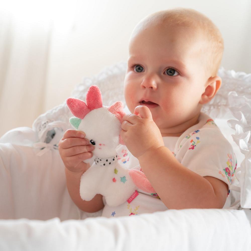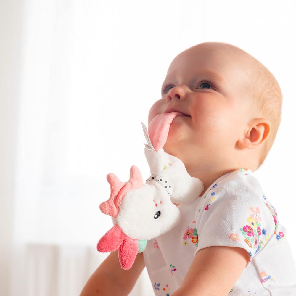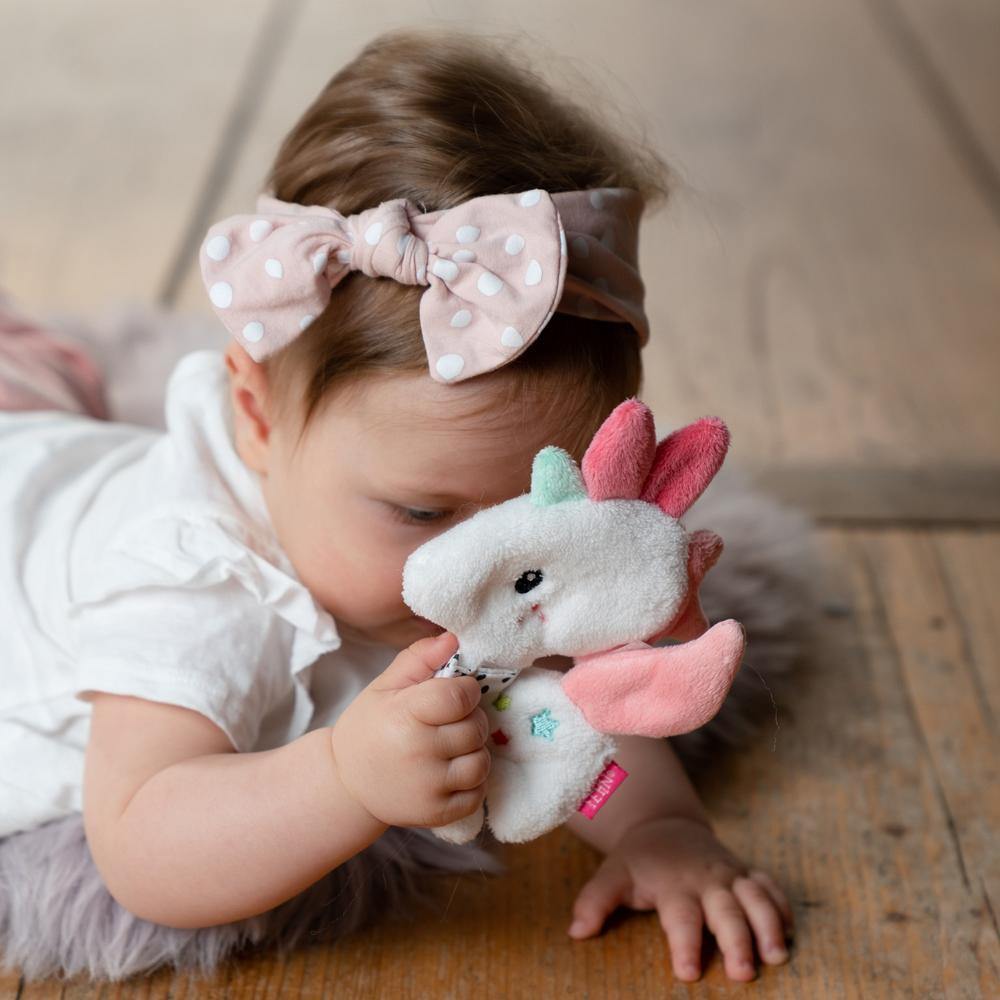 El pequeño unicornio entrena el sentido del oído y el tacto del bebé, crea una curiosidad natural y anima a sentir y jugar: el unicornio con papel arrugado es un compañero devoto para los bebés desde el nacimiento.
