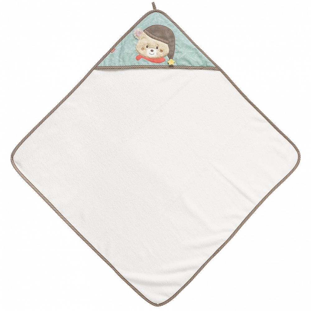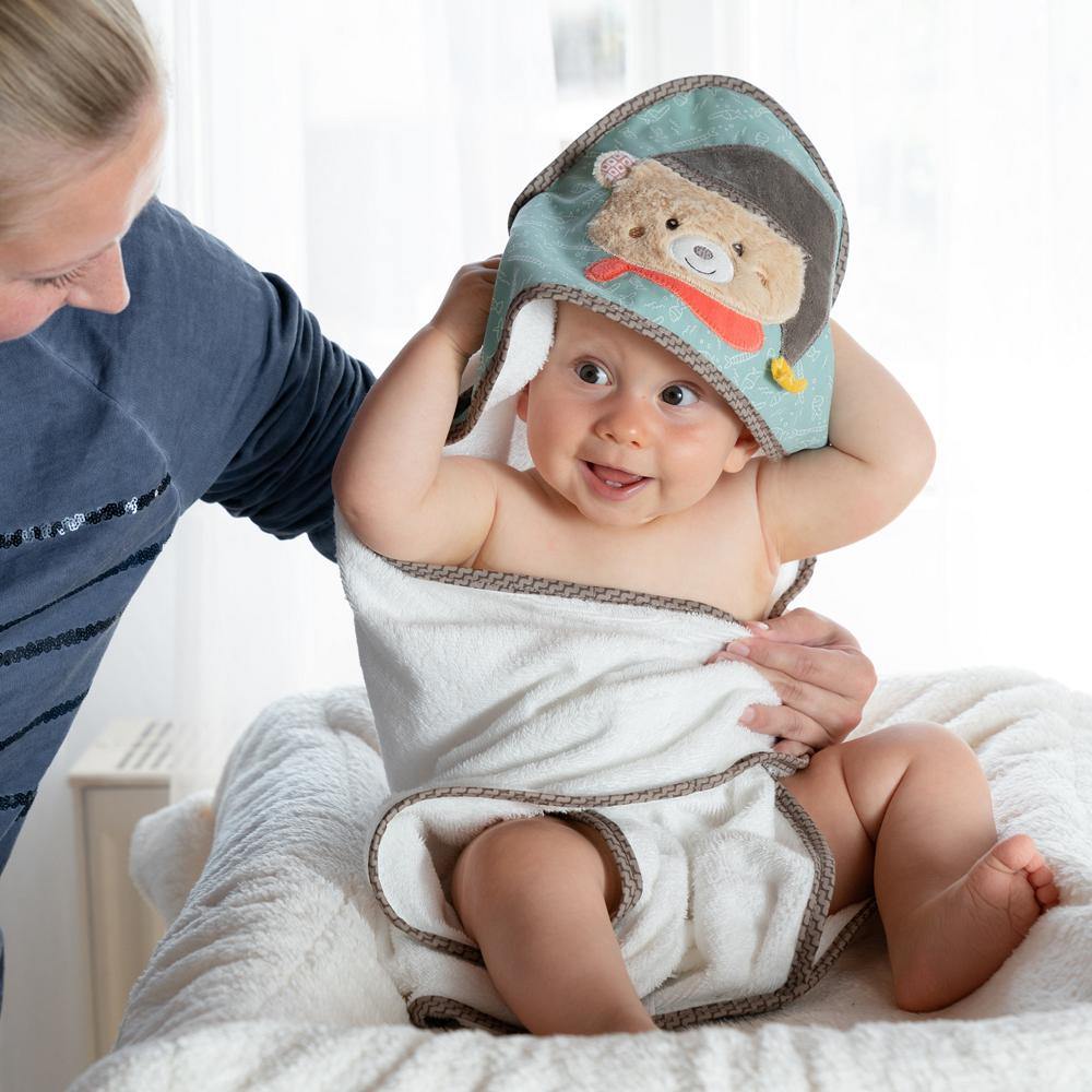 Toalla de baño de algodón con un simpatico oso para bebés y niños a partir de 0 meses. Con la toalla altamente absorbente con capucha los bebés están abrigados y protegidos del frío y las corrientes de aire. Tamaño: 80x80 cm.