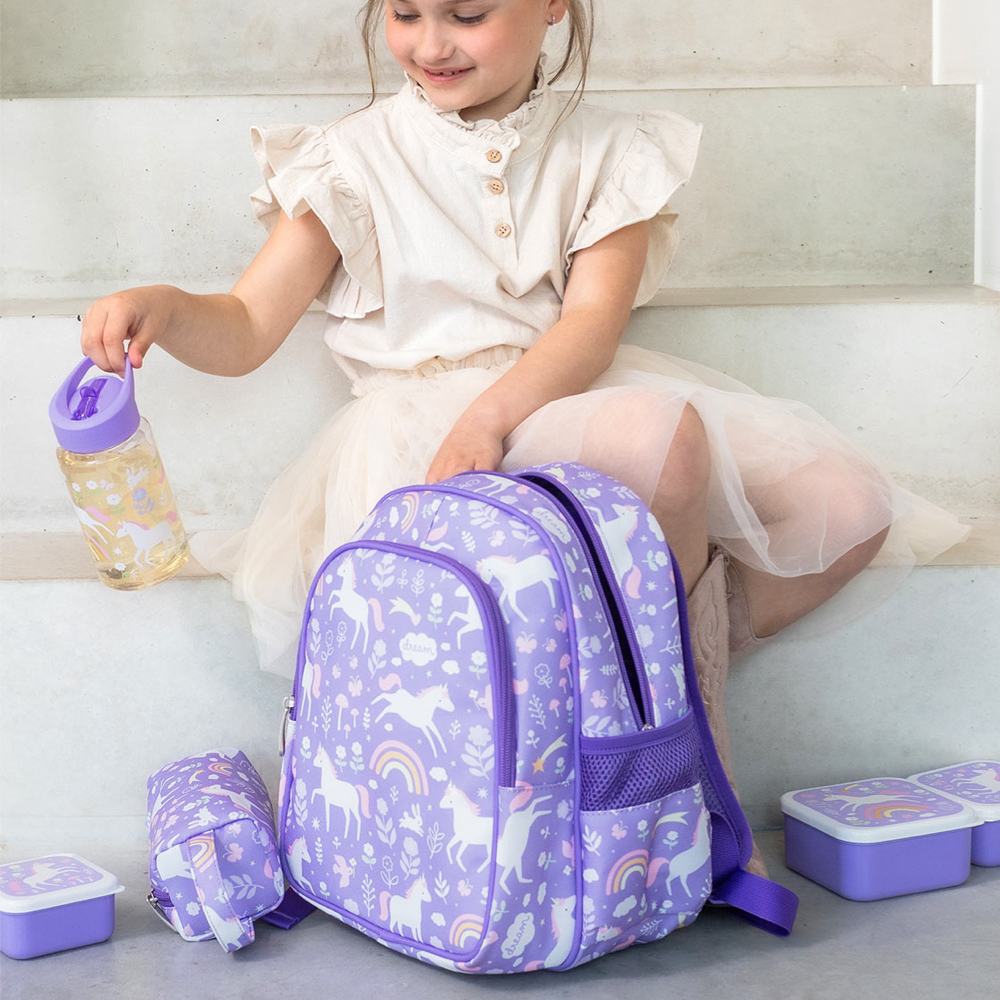 Mochila Grande Unicorn, Botella de Acero y Tupper Unicorn Little para Niños