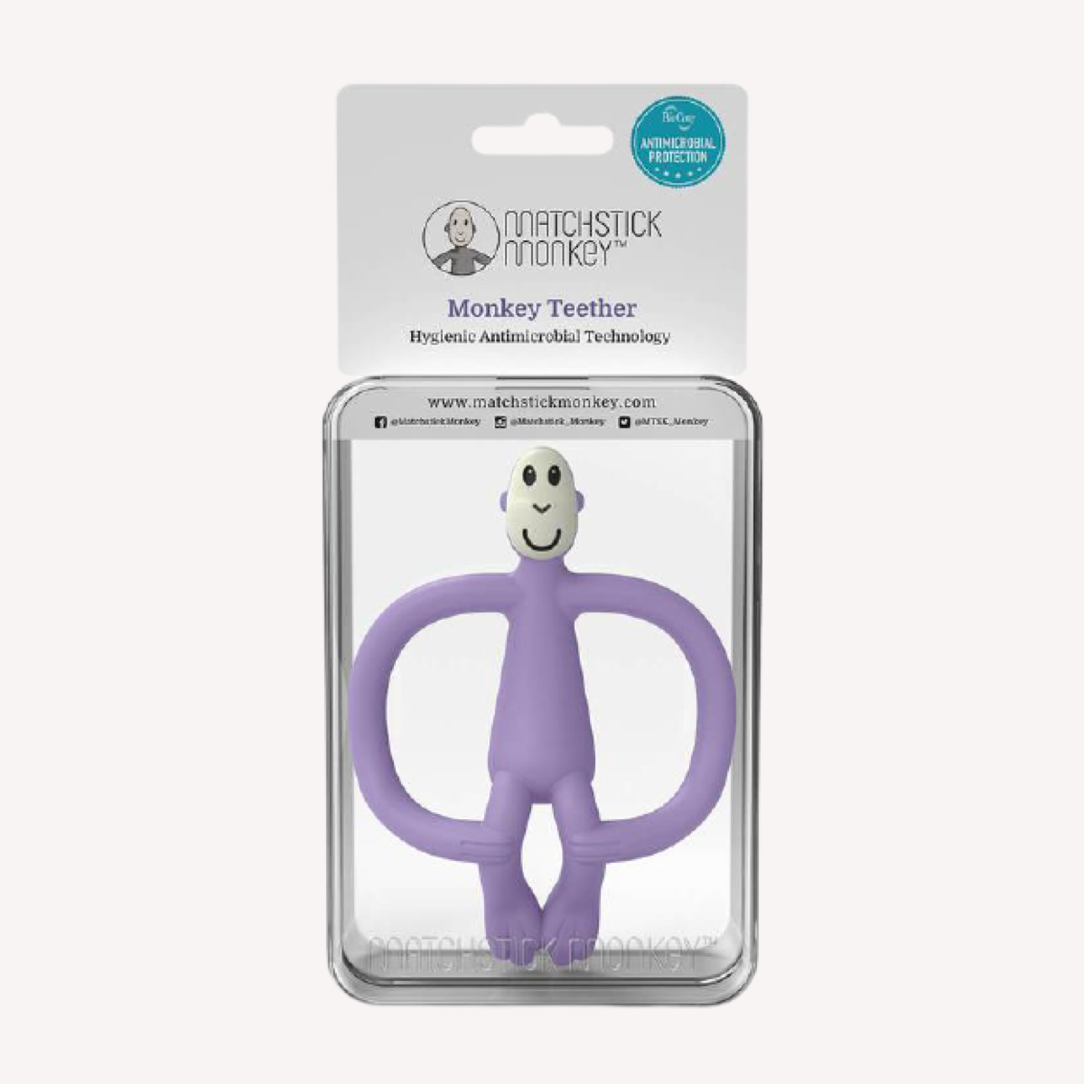 Divertido y flexible, tus pequeños pueden masticar lo que quieran mientras calman sus encías doloridas. La tecnología antimicrobiana BioCote® ayuda a mantener a raya a los gérmenes, mientras que las puntitos que hay detrás de la cabeza del monito llevan el mordedor para la dentición directamente a la fuente del dolor, sin necesidad de dedos. Color Lila.