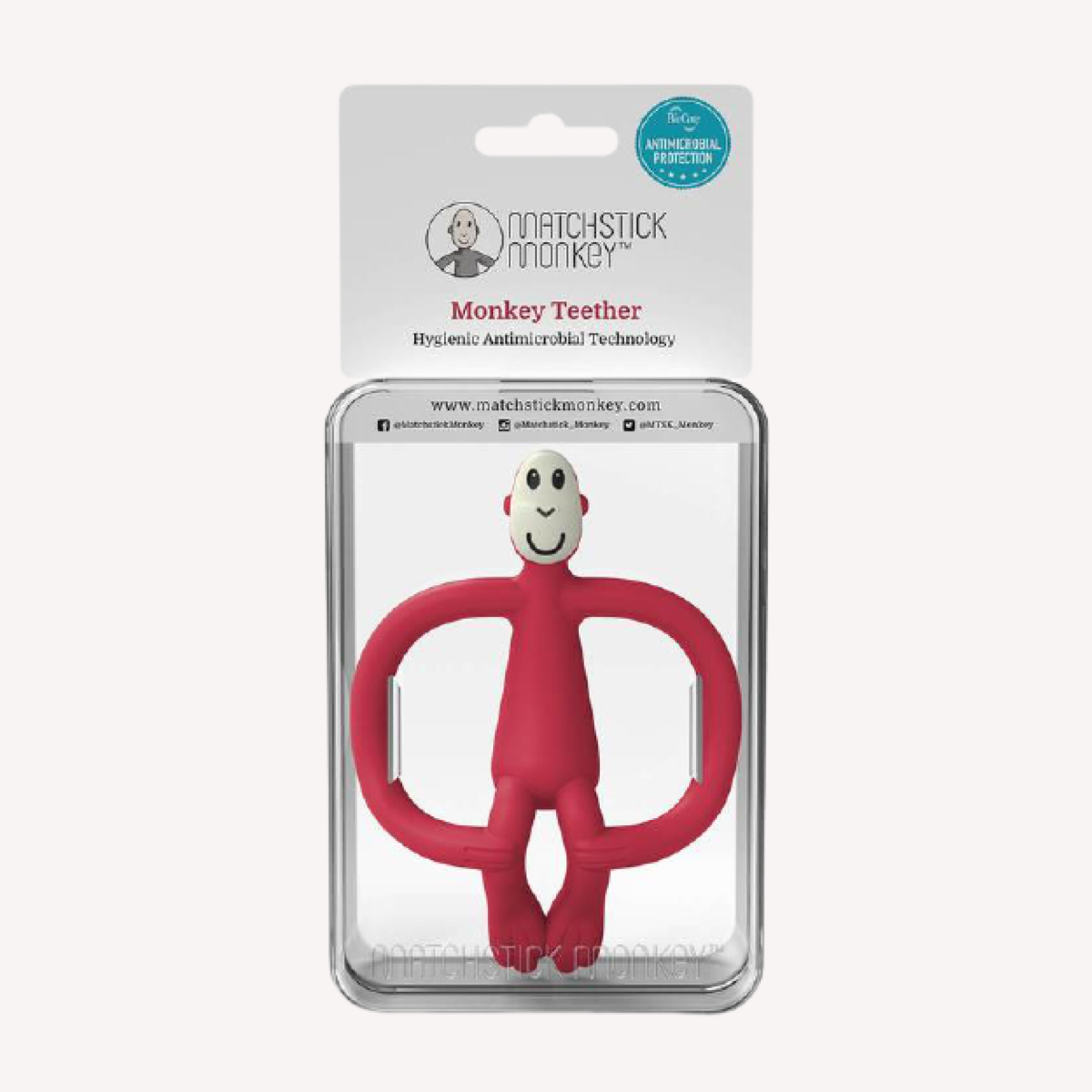 Divertido y flexible, tus pequeños pueden masticar lo que quieran mientras calman sus encías doloridas. La tecnología antimicrobiana BioCote® ayuda a mantener a raya a los gérmenes, mientras que las puntitos que hay detrás de la cabeza del monito llevan el mordedor para la dentición directamente a la fuente del dolor, sin necesidad de dedos. Color Rojo.