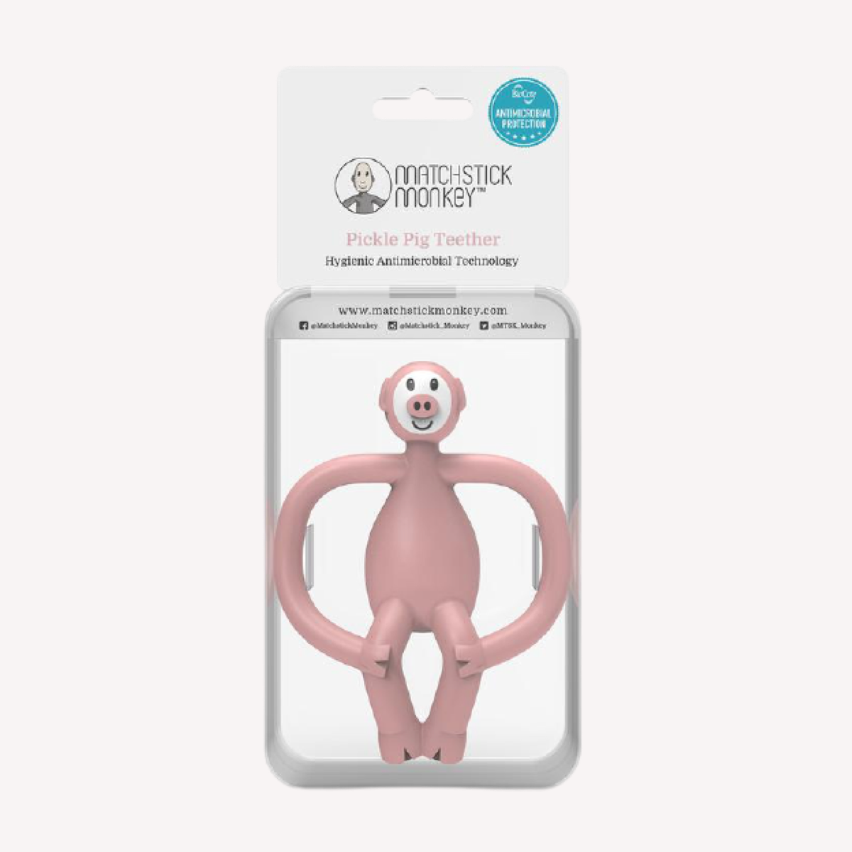 Divertido y flexible, tus pequeños pueden masticar lo que quieran mientras calman sus encías doloridas. La tecnología antimicrobiana BioCote® ayuda a mantener a raya a los gérmenes, mientras que las puntitos que hay detrás de la cabeza del monito llevan el mordedor para la dentición directamente a la fuente del dolor, sin necesidad de dedos. Mordedor del animal cerdo.