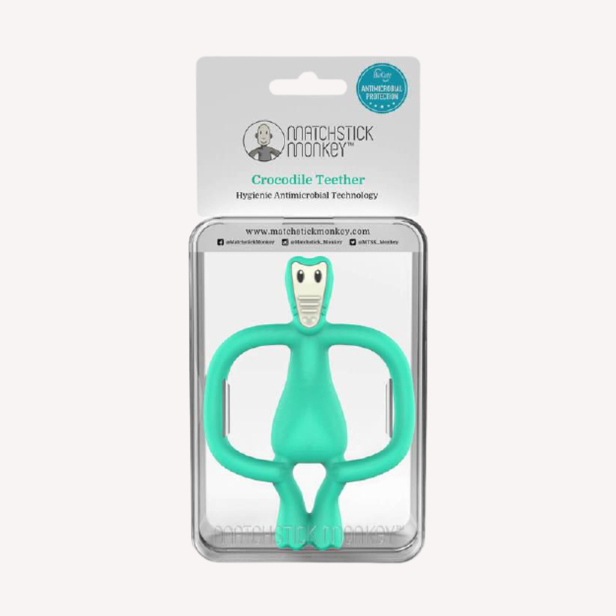 Divertido y flexible, tus pequeños pueden masticar lo que quieran mientras calman sus encías doloridas. La tecnología antimicrobiana BioCote® ayuda a mantener a raya a los gérmenes, mientras que las puntitos que hay detrás de la cabeza del monito llevan el mordedor para la dentición directamente a la fuente del dolor, sin necesidad de dedos. Mordedor del animal cocodrilo.