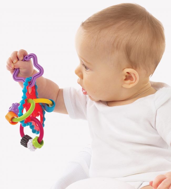 El mordedor sonajero Trebol ¡es pura diversión! Este sonajero mordedor estimulará los sentidos del bebé gracias a todos sus anillos de colores y piezas con diferentes texturas. Su diseño está adaptado totalmente a los pequeños dedos y manitas del bebé, para que pueda agarrar el juguete y explorarlo con total facilidad. Además, tiene piezas con texturas que ayudan a calmar el dolor de encías durante la dentición.