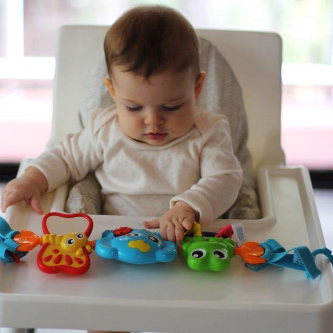 Los personajes llevan un espejo que refleja la luz, mientras los colores vibrantes y patrones promueven la percepción visual del bebé.