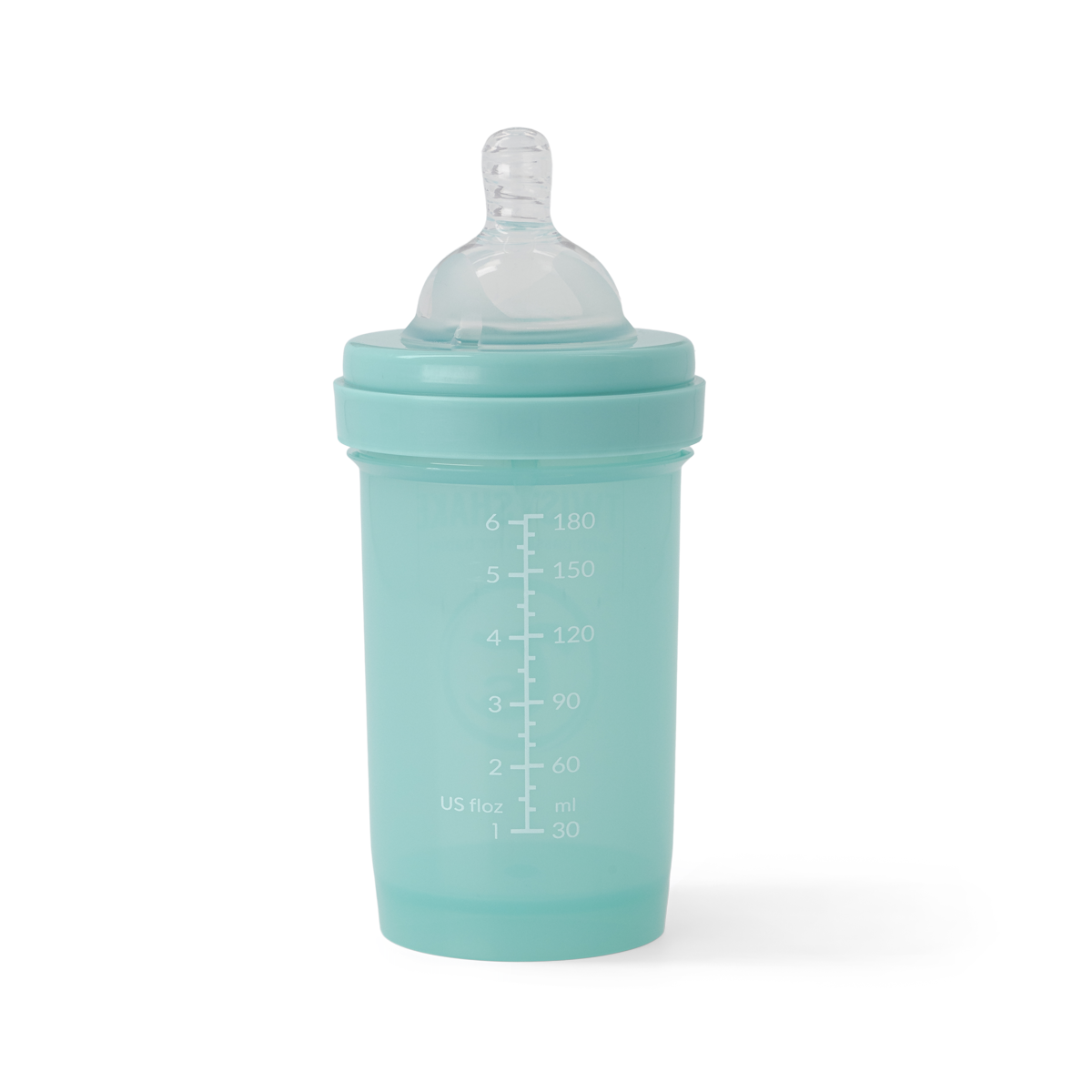 Biberón anti-cólico de 180ml en color turquesa, diseñado para prevenir cólicos y facilitar una alimentación tranquila. Incluye una tetina de silicona suave y una válvula de aire eficiente.