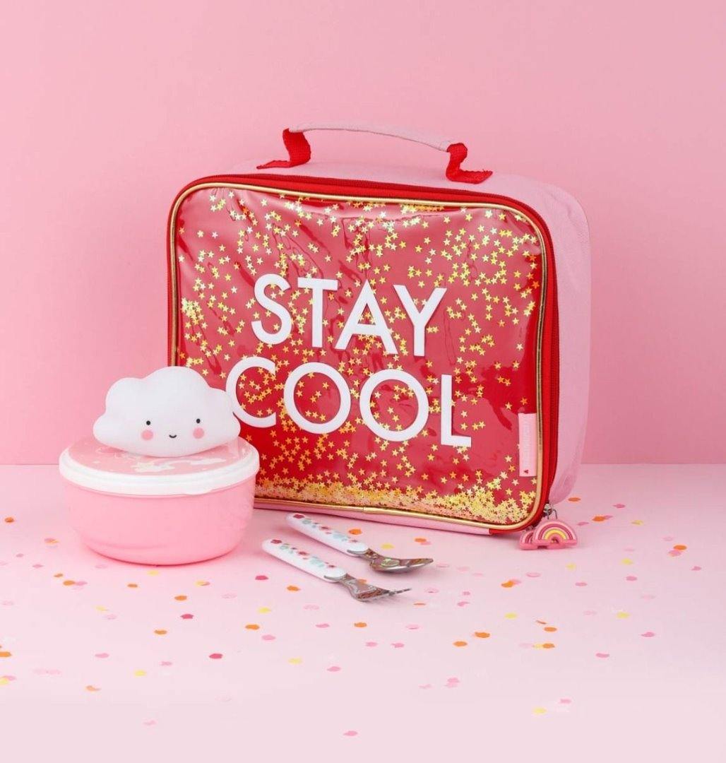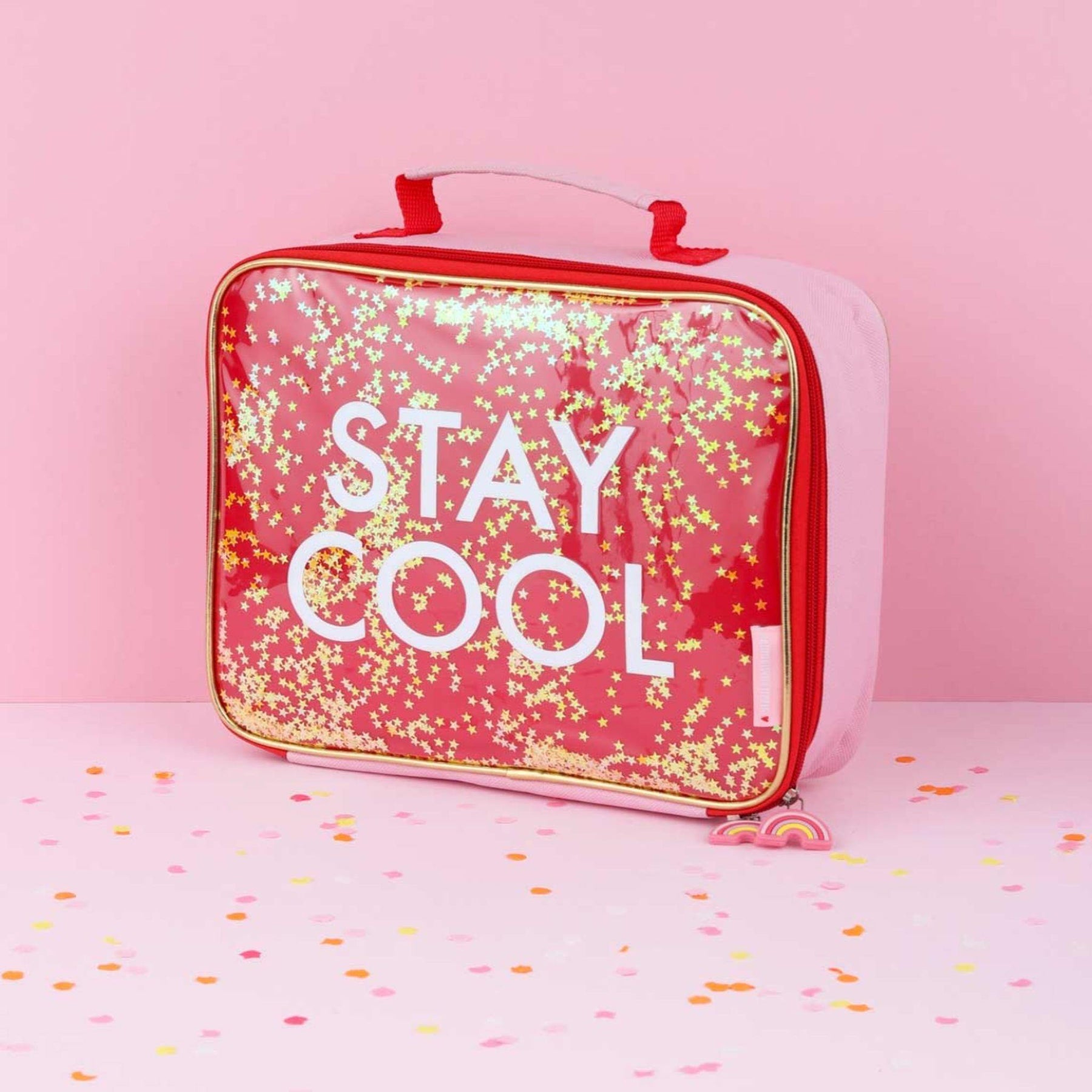 ¡Mantente fresco! En la escuela o mientras viajas con esta brillante nevera. La bolsa aislante tiene un asa práctica, se cierra fácilmente con una cremallera y es lo suficientemente grande para un almuerzo, algo de fruta y una bebida. ¡Los brillos en movimiento hacen que esta nevera sea aún más divertido!