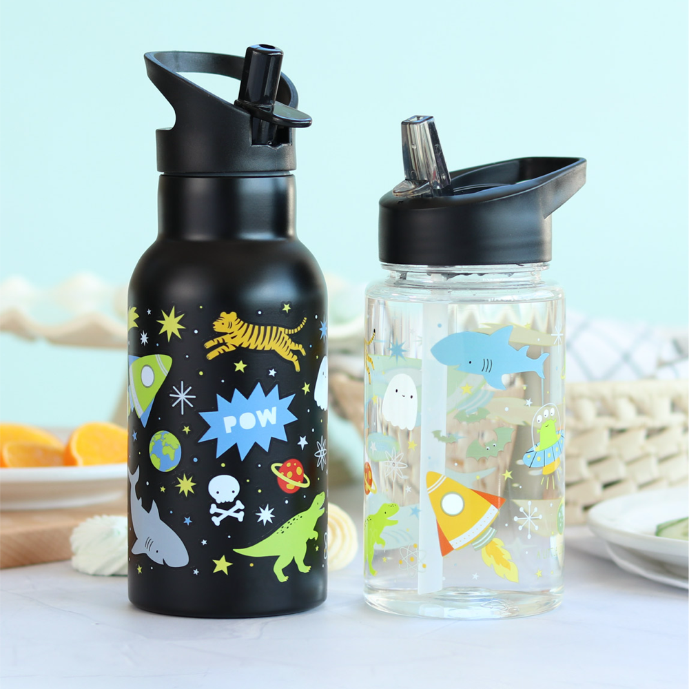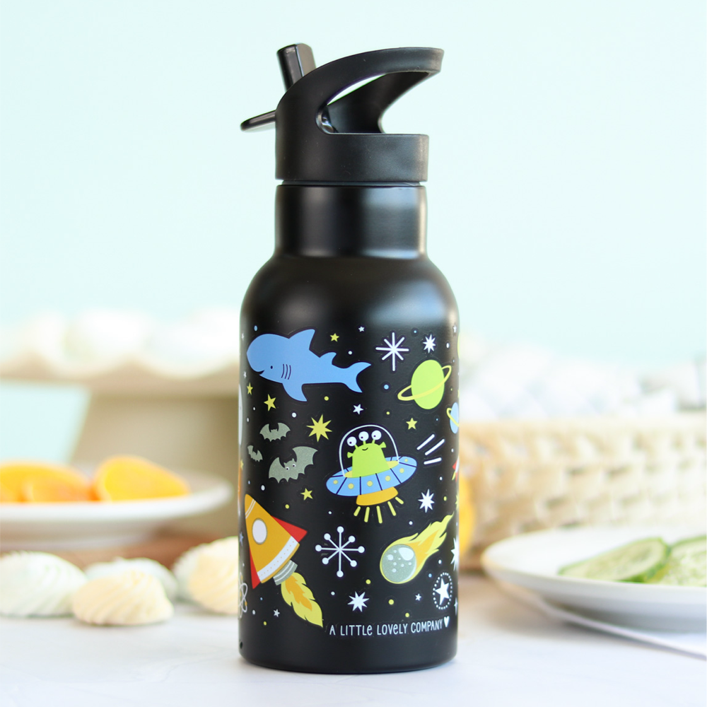 Botella de acero inoxidable de la colección Galaxy de Little. Mantiene las bebidas a la temperatura deseada durante horas, con un diseño robusto y elegante.